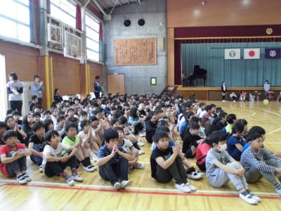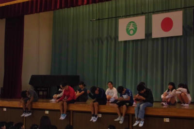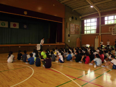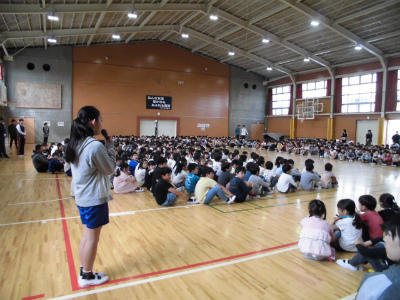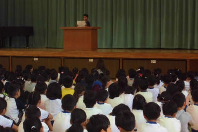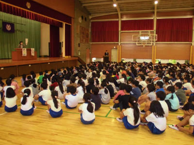 全校朝会です。しっかりした態度で話を聞くことのできる豊春小の子どもです。