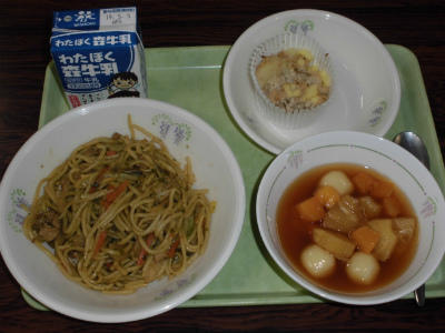 今日の給食は、やきそば、牛乳、ツナとポテトの香り焼き、フルーツ白玉でした。みんなおいしくいただきました。