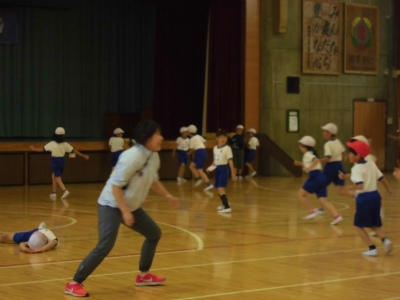 3年生 体育 素早く動きます。先生にタッチされないように、上手く逃げます。