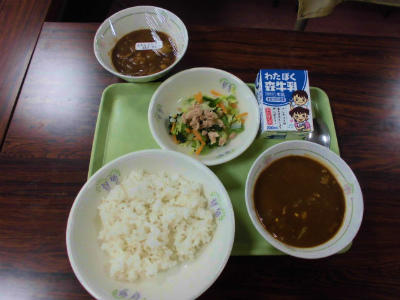 献立 麦ごはん、カレールウ、牛乳、青菜のソテー