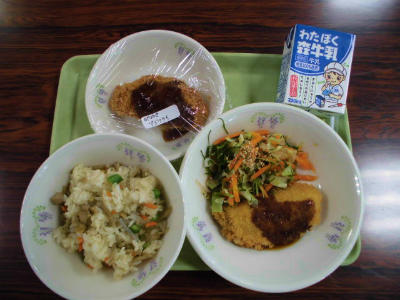 献立 グリンピースわかめごはん、牛乳、キャベツ入りメンチカツ、切り干し大根の和え物