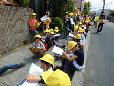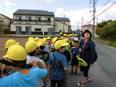 2年生 まち探検 先生の指さす方向をみんなで見ています。素敵なことが見つかった