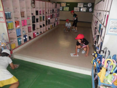 昇降口の隅々まで、用具をどかしながらぞうきんがけをする姿、傘立ての傘をきちんと整頓する姿など、言われなくても考えてできる豊春っ子がいます。