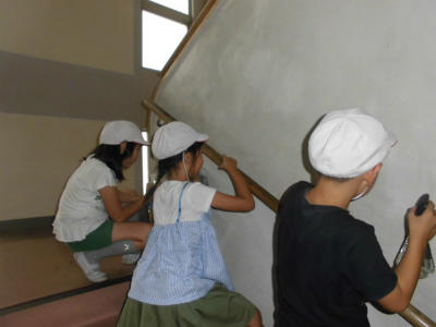 階段そうじでは、霧吹きを使いながら壁の汚れを落とす児童がいました。自分たちで考え