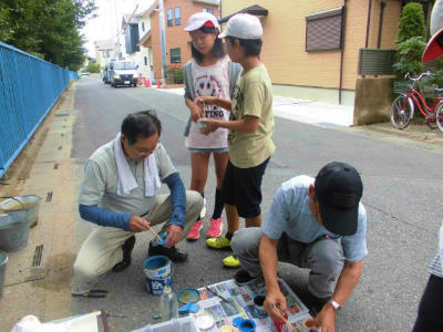 なかなか苦戦しながらも、楽しくペンキ塗りができました。地域の学校応援団の方からレクチャーを受け、自分で色を決めて塗っていきます。