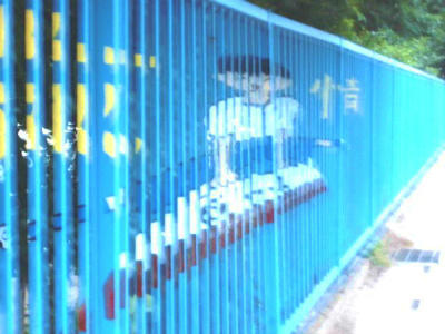 お二人の先生は、午前中から準備を始めています。子どもたちの描いた絵柄をフェンスの幅に合わせて切り、セロテープで留めています。また、カーボン紙を使ってフェンスに印を付けています。