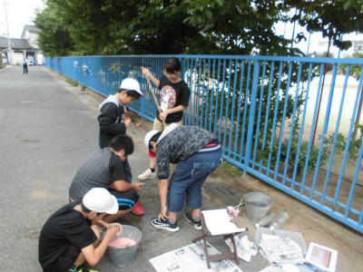本日は、6年1組の子どもたちが地域の先生に教えていただきながら、フェンスに絵を描きました。先輩の描いたアートにもさらに色を塗り重ね、きれいにしました。