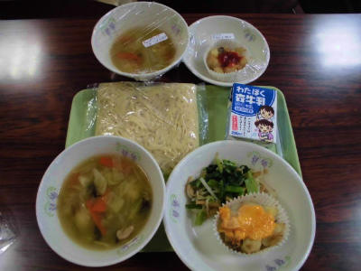 ごはん、牛乳、和風卵焼き、かけ和え、うったち汁