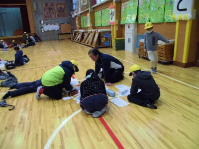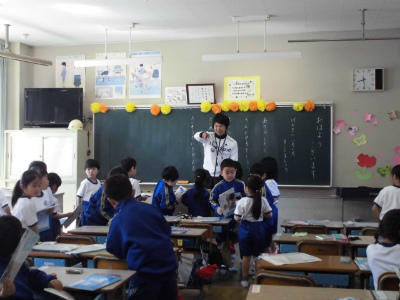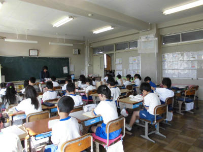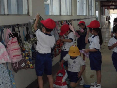 体育朝会を2~6年生が行っているときに、各学級ではそれぞれに過ごし、朝の生活について確認していました。クラスでの動線、荷物の片付け方などもよくできるようになってきました。