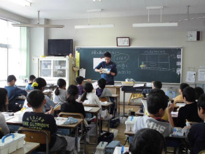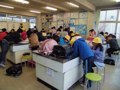 理科室では、5年生が大きなビーカーも使いながら、物が溶ける様子を観察しようとしていました。