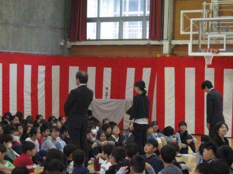 代表児童に修了証書を渡しました。関係学年、学級の子どもたちは、一緒に起立・礼をしました。