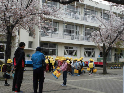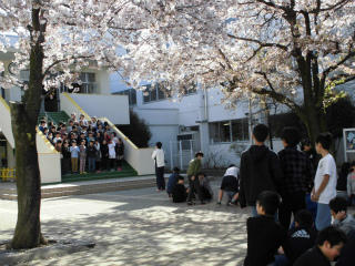 中庭の桜の下で下校準備をしております。揃って帰ります。