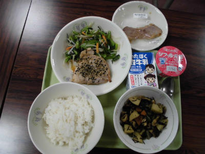 献立 ごはん、豚肉の南部焼き、小松菜のお浸し、磯煮、ヨーグルト