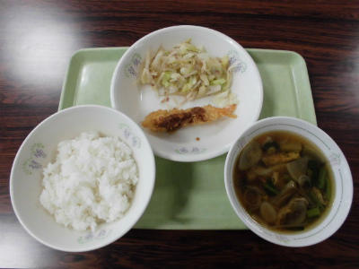 献立は、ごはん、牛乳、えびフライ、春キャベツのおかか炒め、けんちん汁