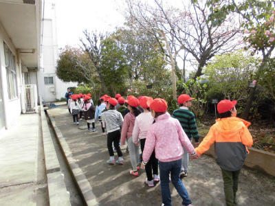 1年生が校庭に出て学校巡りをしています。いろいろなところに目がいきます。