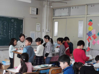 インフルエンザがはやっていますが、3-1、2-1は欠席者ゼロでした。元気に給食をいただく子どもたち。欠席ゼロのクラスの写真を撮りに訪問したので、うれしいポーズも見せてくれました。