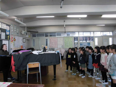 始業式が終わった後、6年生はすぐに入学式の準備です。校歌の歌を練習しています。