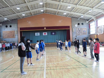 5年生 全員で鬼ごっこのような陣地取りのようなゲームで楽しんでいます。