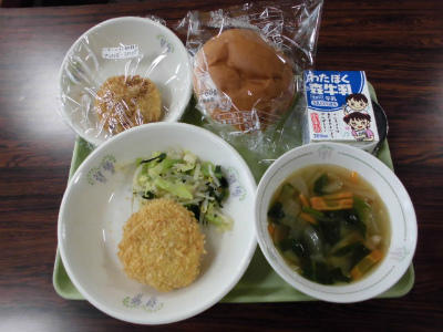 献立 子どもパン、牛乳、コロッケ、野菜ソテー、春雨スープ
