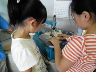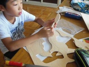 5年生は図工の授業です。糸のこ盤を使って、木を切り、