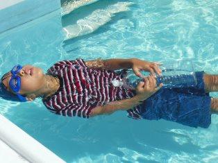 次にペットボトルを持って、プールに入りました。