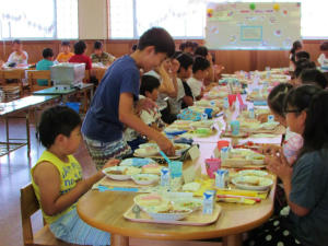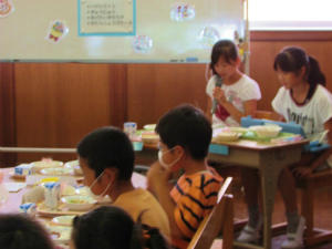 たちと食べる給食に大喜びでした。高学年の児童が低学年の児童の面倒を見ながら