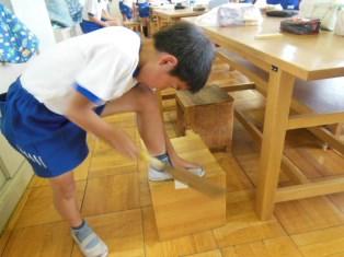 4年生は図工の授業で、木材をのこぎりで切っています。ちょっと難しそうですが、