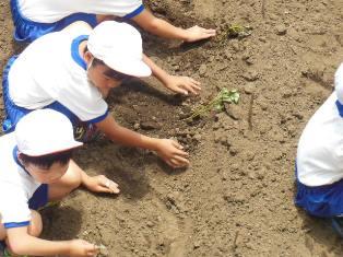 苗を折らないように植え付けました。下は、サツマイモの苗の植え付けです。