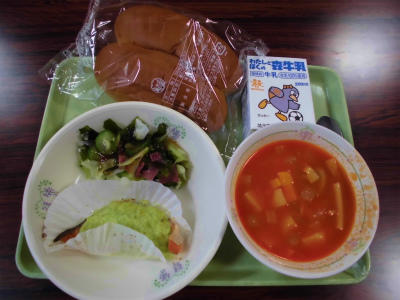 ぶどうパン 牛乳 グラタン アスパラサラダ 野菜スープ