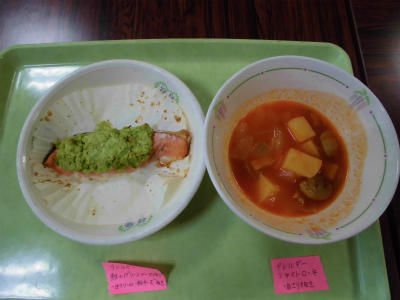 アレルギー対応はごまぬきの鯖、交流給食の5-1、1-1の児童はみかんジュースです。