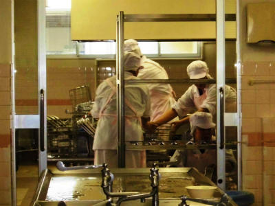 美味しい給食ができる前の給食室の様子です。調理員さん、忙しそうですね。