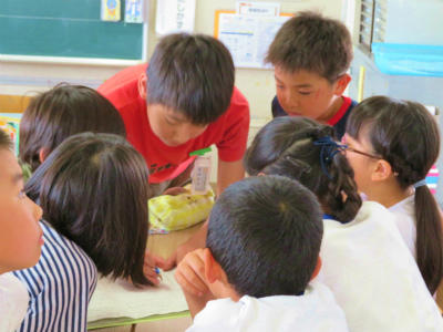 3年生:キャベツの葉っぱから、幼虫を見つけ出し、観察していました。ルーペでじっくりとみていました。
