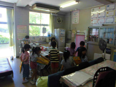 栄養士の先生から豆のむき方を教えていただき、丁寧にさやから豆を出していきました。今日の給食でいただきます。よい香りも一足先に味わえた子どもたちです。