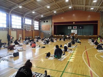 体育館で学年ごとに競書会を行いました。3年生は、「せかい」4年生は、「竹うま」と書きました。