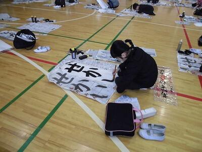 静寂に包まれた体育館の中で、子ども達は、真剣に書きぞめに向き合っていました。