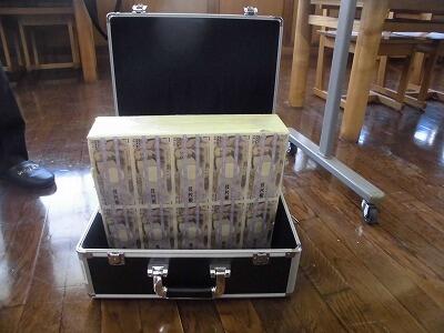 子ども達は、1人1人この1億円を持たせてもらいました。1億円で10kgになります。
