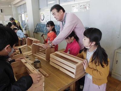 きめ細かい指導のお陰で、子ども達は、金づちを使ってまっすぐに釘を打つことができました。