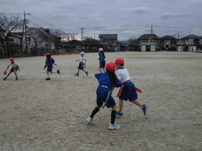 タグラグビーは、腰のところについたタグを2つ、相手チームに取られずに、ボールを運ぶことができたら得点が入ります。