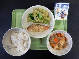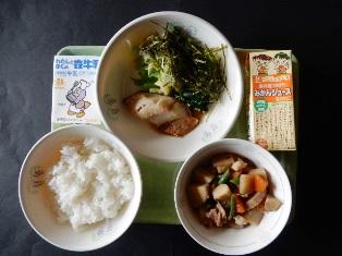 献立は、ごはん、ほっけの塩焼き、磯香和え、筑前煮、牛乳です。