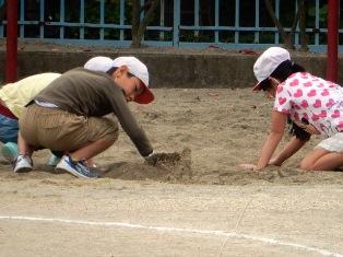 朝マラソン前の砂場の様子です。3人で一生懸命に砂を