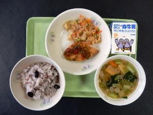 ビビンバ、わかめスープ、牛乳です。交流給食の学級は、牛乳の