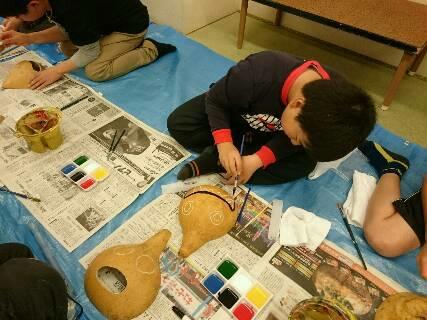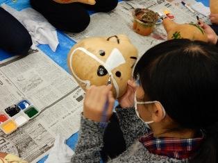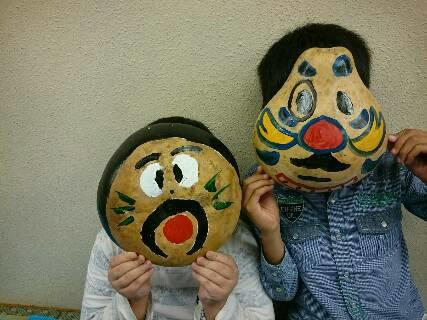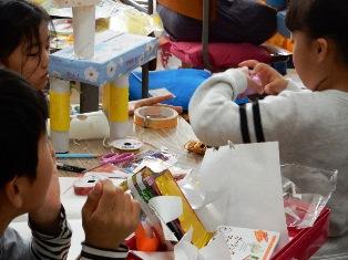 1年生は図工の授業で、マヨネーズなどの容器を使って息を吹くと