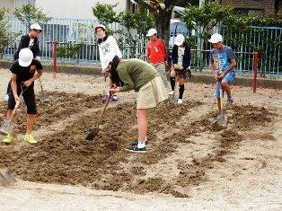 砂場では、運動委員会の皆さんがスコップで砂をフカフカにしています。