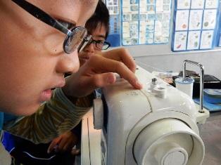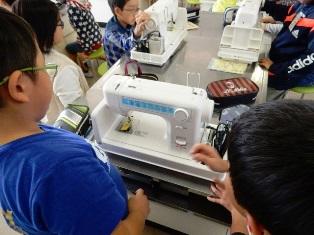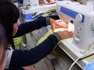 5年生は家庭科の授業で、エプロンを作っています。仮縫いのようです。