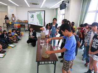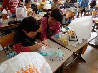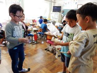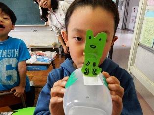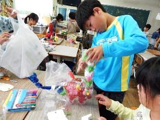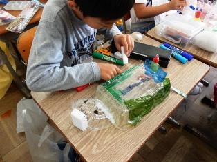 2年生は図工の授業で、コップやペットボトルなどを使って
