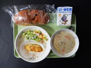 ぶどうパン、白身魚のカレー風味、コールスローサラダ、クラムチャウダー、