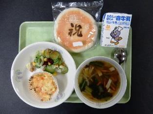 セレクトお祝いパン、グラタン、ビーンズサラダ、春雨スープ、