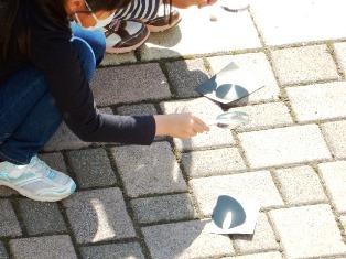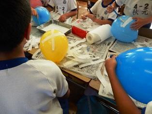 4年生は図工の授業で、風船に紙を貼り合わせて、卵を作ります。