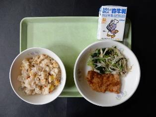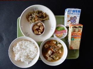 ごはん、いかの照り焼き、白菜のおひたし、肉じゃが、牛乳です。