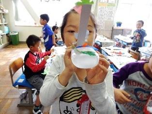 1年生は、紙コップと松ぼっくりで楽しそうなおもちゃを作って